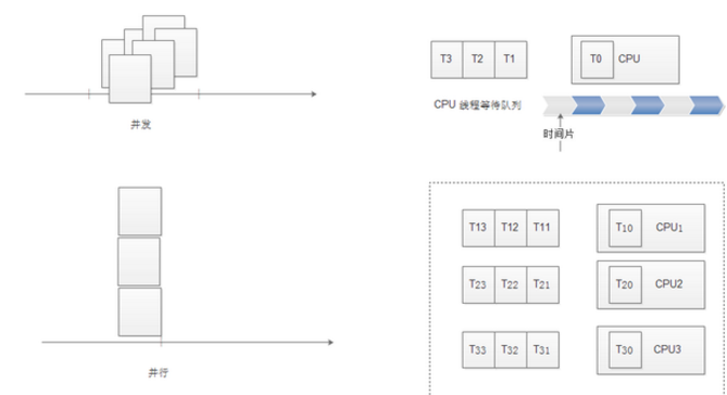并行需要两个或两个以上的线程跑在不同的处理器上,并发可以跑在一个处理器上通过时间片进行切换。