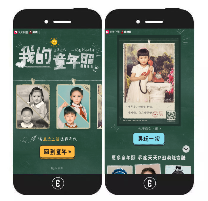 内容特色:该H5包含6种不同年代的人脸融合模板,用户可通过选择合适的模板并上传照片,获得专属年代照。