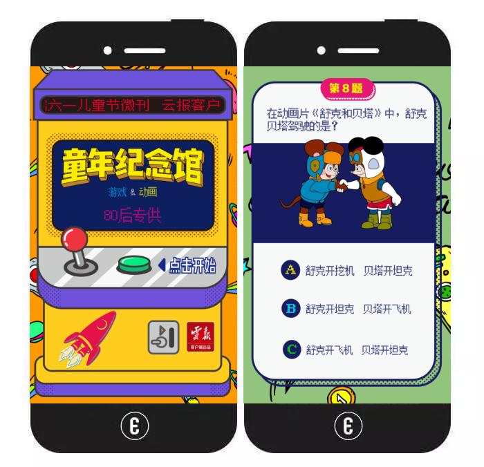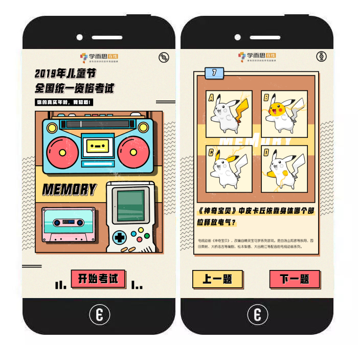 内容特色:该H5主要针对80后用户,旨在通过答题测试的方式带领用户重回童年。测试题共15题,均与游戏及动画有关,无论用户回答正误与否,都会即时判断对错并给出正确答案。