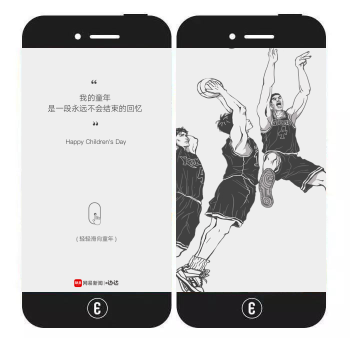 内容特色:该H5以一镜到底的方式展示了《灌篮高手》、《名侦探柯南》、《哆啦A梦》、《火影忍者》、《美少女战士》这5部动漫作品中的经典人物形象。用户可通过滑动屏幕随意控制动画的节奏,并跟着背景音乐及动画画面回忆童年。每部动漫的展示方式都不尽相同,或放大或平移或旋转,有效降低了视觉疲劳。