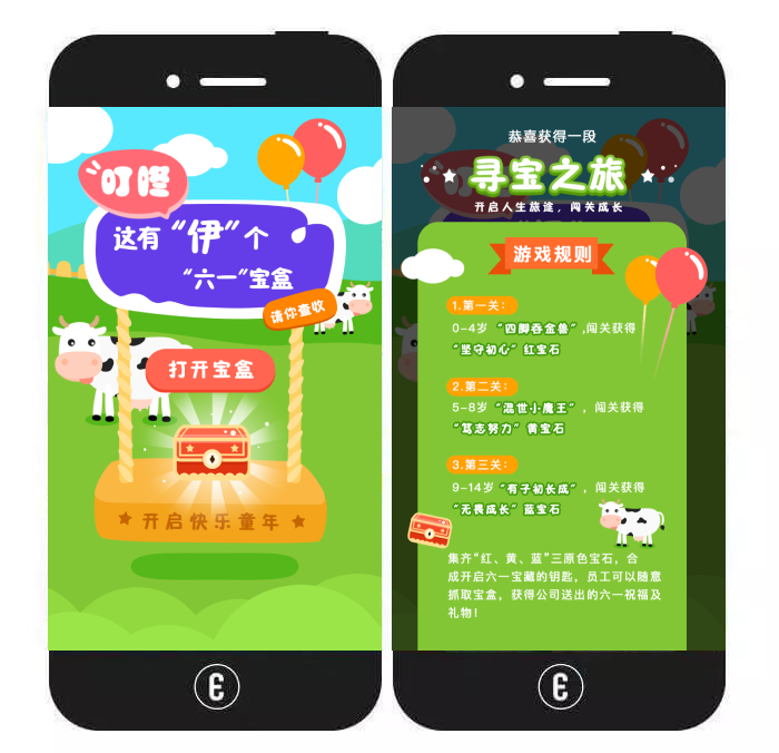 当然,不走情怀路线的H5也是有的,刚刚火热上线的《叮咚,这有“伊”个六一宝盒,请你查收》就是其中之一。这是意派Epub360携手伊利集团共同打造的一款定制型H5,该作品共包含3个小趣味小游戏,闯关成功后,员工(需输入姓名及工号,以验证身份)与非员工还可分别通过不同的通道抓取幸运宝盒哦,赶紧来玩玩吧~