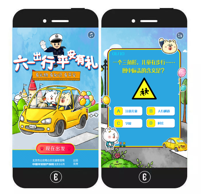 内容特色:该H5旨在通过答题测试的方式检测用户对于安全出行规则的掌握程度,并为六一开车出行进行安全宣传。用户可先浏览四个动画场景及游戏规则再进入测试环节,测试题共10个,若全部答对,即可输入姓名及电话,以便有机会领取相应的奖品,若回答有误,则可通过“再答一次”按钮重新测试。
