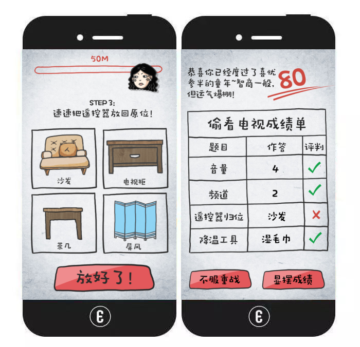 内容特色:该作品为用户构建了一个趣味选择型的H5微场景,通过很多人小时候都经历过的事——偷看电视来引起广泛共鸣。用户需在有限的时间内调回打开电视时的音量和频道、把遥控器放回原位、选择终极道具给电视降温,以躲过妈妈的火眼金睛。作品最后,用户还可根据自己的选择获得一份“偷看电视成绩单”。