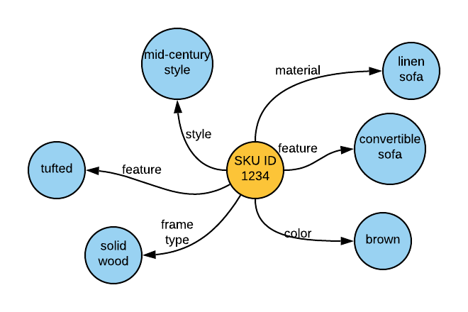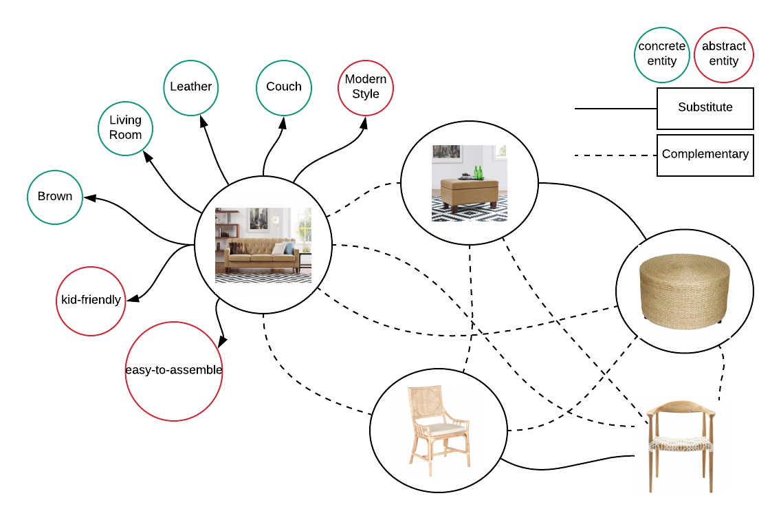 零售图谱捕获了零售世界中存在的产品和实体之间的连接。实体是存在的物体、事物、概念或抽象,例如客厅、野生动物摄影、颜色、农舍风格。我们关注的实体大致有两种:抽象的和具体的。前者帮助我们回答诸如“夏日游泳池派对用品”、“农家客厅家具”、“野生动物摄影镜头”之类的问题,而后者帮助我们回答诸如“蓝色牛仔裤裤子”、“木制餐桌”之类的问题。该图谱还将产品之间的关系捕获到两个类别,替代品和补充品(附件、兼容产品等)。它还试图将抽象概念(如亮色)映射到具体的产品属性。