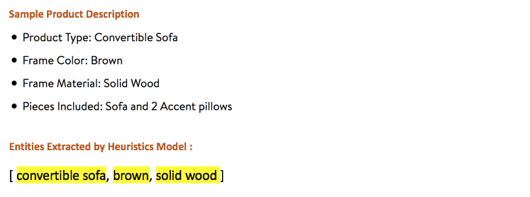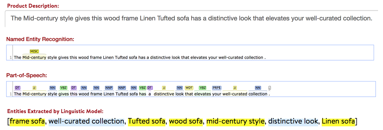 我们首先从产品标题、描述和其他元数据中提取实体。这是通过建立一个语言模型来实现的,该模型利用了Standford Core NLP提供的POS标记。这个模型更适合我们的用例,因为产品标题和描述通常是以项目符号的形式出现的,以产品亮点为特征,而不是构造良好的句子。下面是我们基于NLP的模型的输出示例。