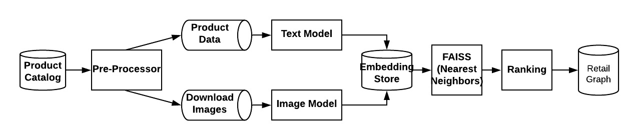 为了识别给定产品的替代品,我们同时利用文本数据和图像数据。在家具、服装等产品类别中,视觉相似性在识别替代品方面起着重要作用。我们为我们的产品构建了图像嵌入和文本嵌入,并将它们放入FAISS索引中(FAISS是Facebook开发的一个高效相似性搜索和向量聚类库)。对于每个产品,我们从文本嵌入和图像嵌入两方面生成其KNN(k近邻),以得到候选集。在那之后,我们应用一个类别特定的排名逻辑来得出最终的结果。例如,在家具类别的情况下,“家居装饰风格”(中世纪/沿海/农舍)在确定可替代性方面起着关键作用。