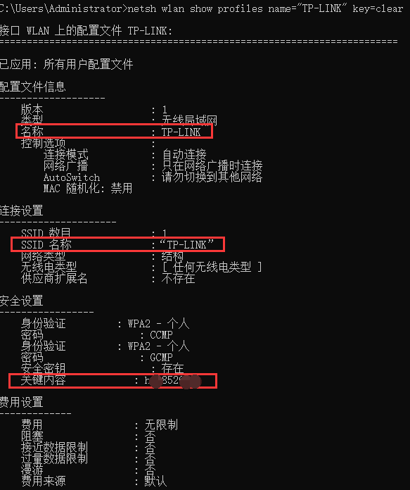 for /f "delims=" %%a in ('netsh wlan show profile name^="%*" key^=clear ^| findstr /c:"Key Content"') do (