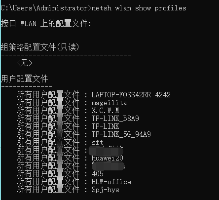 for /f "tokens=1* delims=:" %%i in ('netsh wlan show profiles ^| findstr /c:"All User Profile"') do (