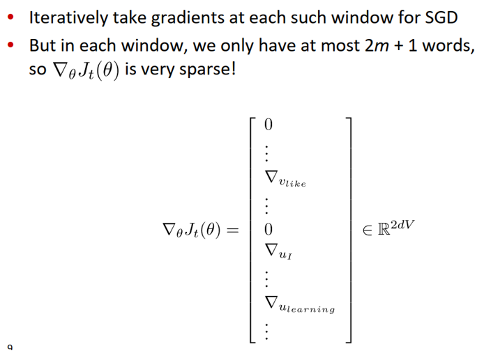 在一个window中,至多只有2m+1个词,所以梯度很稀疏(下图示例为:center word:like,contextwords:I,learning等)。
