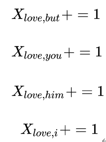 以窗口5为例说明如何构造共现矩阵。中心词为love,语境词为but、you、him、i;则执行:
