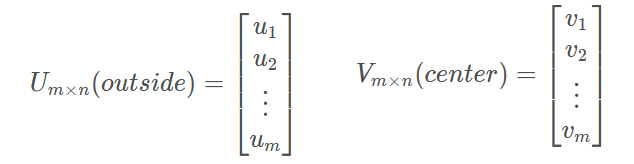 假设vocabulary包含m个词,每个词向量长度为n, 对于每一个词,作为中心词(center)和非中心词(outside)时分别使用v和u两个向量表示。在计算完成后将两个向量平均作为最终词向量表示。