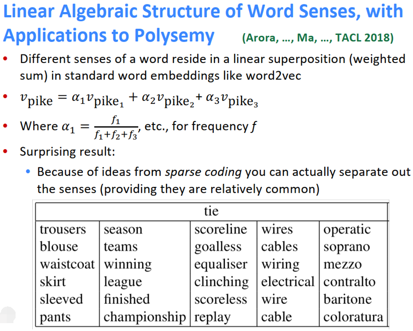 Linear Algebraic Structure of Word Senses, withApplications to Polysemy (Arora, …, Ma, …, TACL 2018)