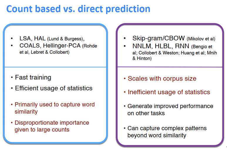 左边是基于计数的方法的一些特点:训练快、有效利用了统计信息、初步统计了词的相似性