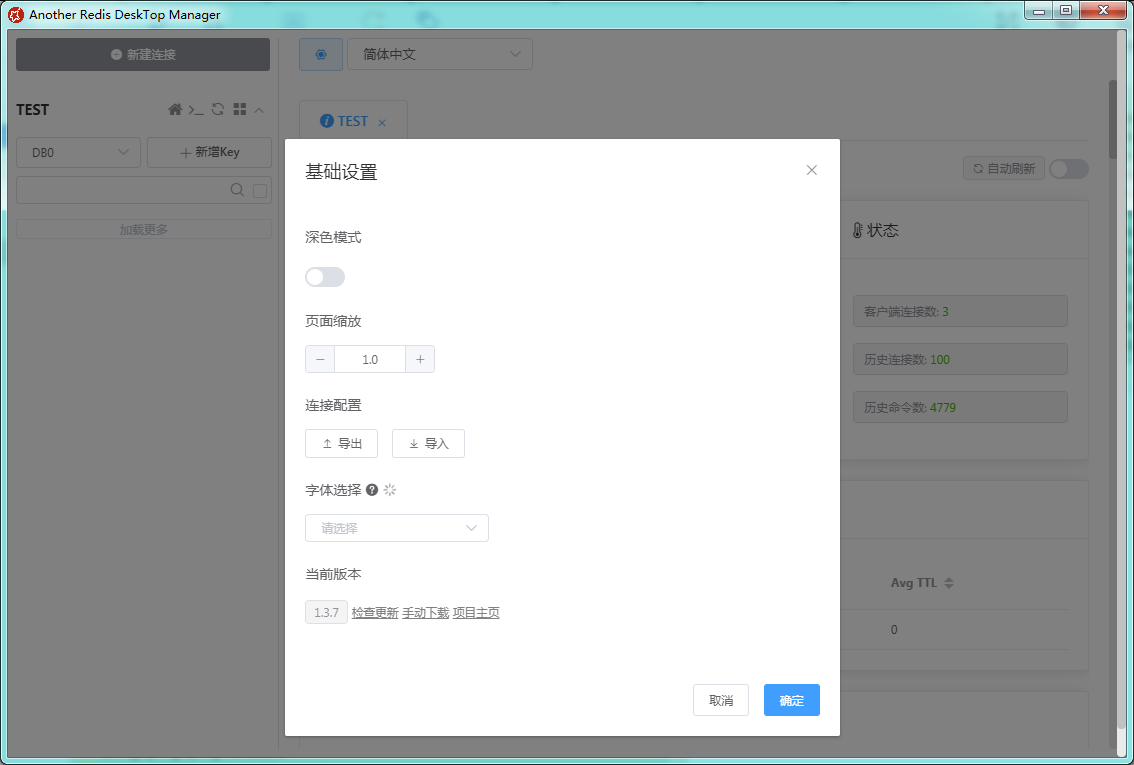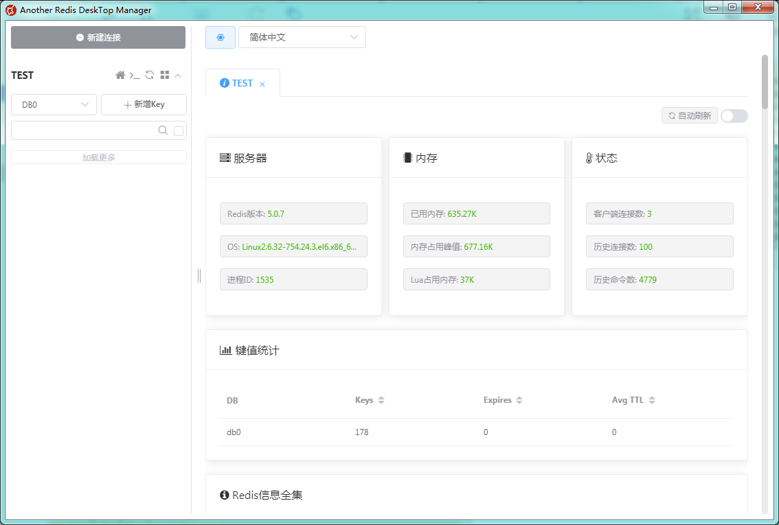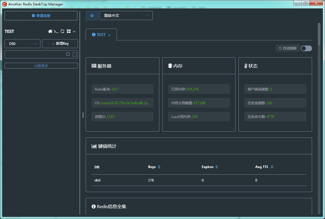 主页面支持基础设置、中英文切换,连上之后还会显示服务器、内存、状态、键值统计、Redis全集信息,这些信息还能自动刷新。