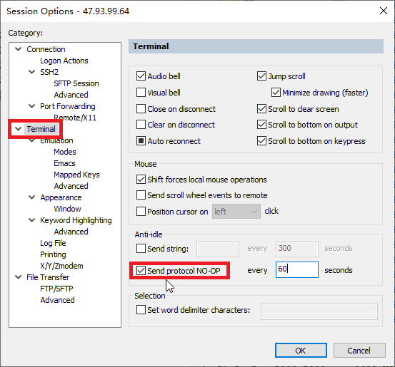 2. 在打开的选项卡中,选择 Terminal,在 Anti-idle 一栏,选择 Send protocol NO-OP。完成。