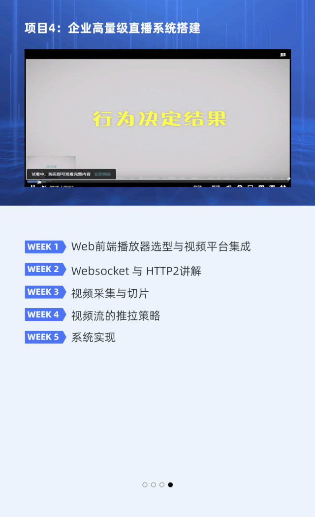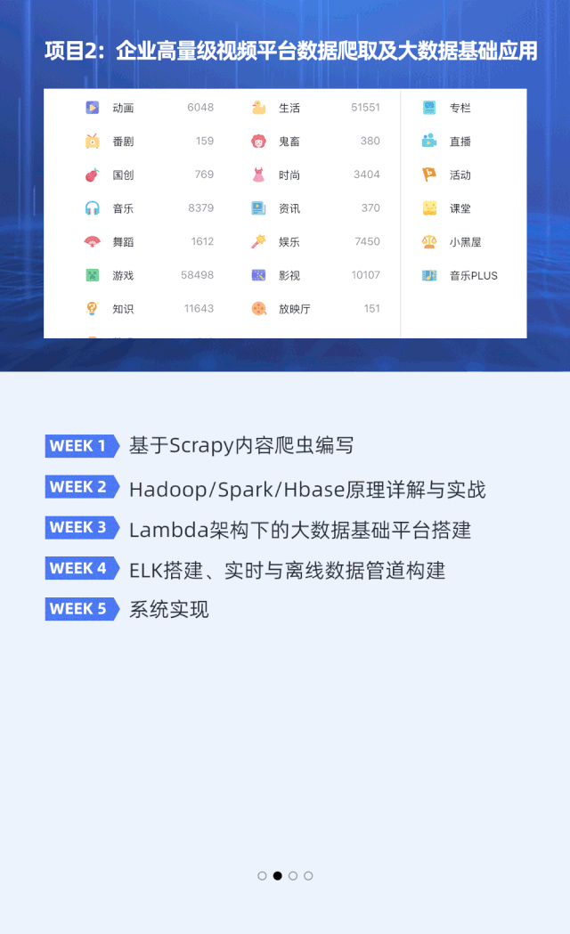 包含企业高量级视频平台及CRM系统、企业高量级视频平台数据爬取及大数据应用、企业高量级视频平台内容推荐系统、企业高量级直播系统搭建四个名企实战项目,带你掌握大厂高薪岗位必备技能。