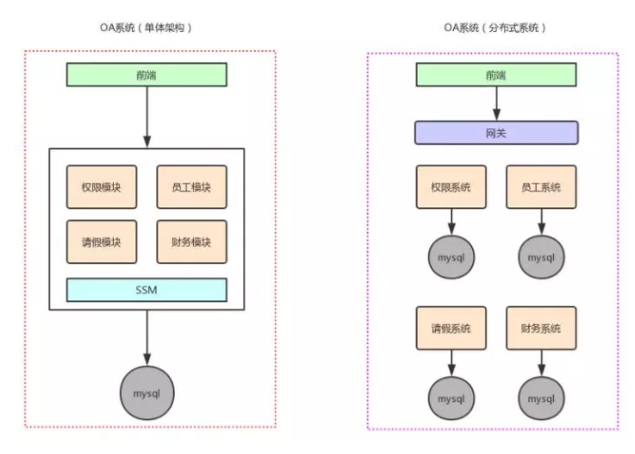 举个例子,假设原来你做了一个OA系统,里面包含了权限模块、员工模块、请假模块、财务模块,一个工程,里面包含了一堆模块,模块与模块之间会互相去调用,1台机器部署。