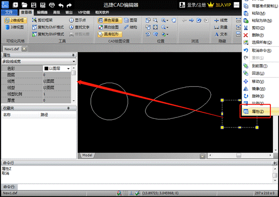通过移动鼠标选择需要得出面积的闭合图形,如四边形。点击鼠标右键,选择【特性】