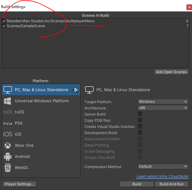 - Click on Build And Run 这一步可以不做,直接把unity工程复制一份,一个server一个client