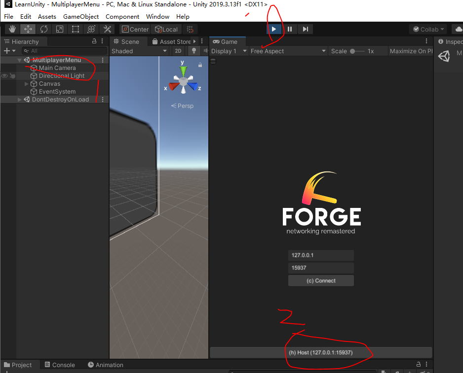 只运行MultiplayerMenu这个场景,2单击表示这个是服务器,运行后