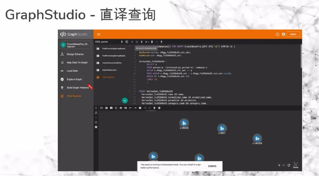 针对开发者,TigerGraph 3.0提供了属性索引、算法、从关系型数据库迁移到图等先进技术,旨在提高开发效率;提升GSQL语言,比新增GSQL联合模式匹配(Conjunctive Pattern Matching),新推出的Per子句主要是在联合模式匹配下,方便进行多步遍历,灵活高效进行聚合运算;提供更加灵活的查询模式等。针对IT运维人员,TigerGraph 3.0通过平台管理、汉化的用户界面、Studio中的多图等,大幅提升运维效率。针对普通的业务人员,尤其是无基础的图分析新人,TigerGraph 3.0提供了无代码分析工具,可以快速完成图探索和图查询,降低了应用的入门门槛。李憓松特别提到了新增的直译查询功能。以往,用户在对查询进行修改或调试后,还要再经过编译才能进行下一次查询,连贯性体验不佳,而直译查询则提升了查询效率。