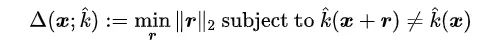 给定一个分类器,样本鲁棒性是使得模型出现误分类的最小扰动,具体形式如下: