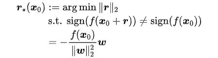 上图为对抗样本攻击线性分类器的图示。其中 为一个二分类器。 为干净样本点 的最短距离,即为样本点 在分类器 中的鲁棒性。 为分类超平面。