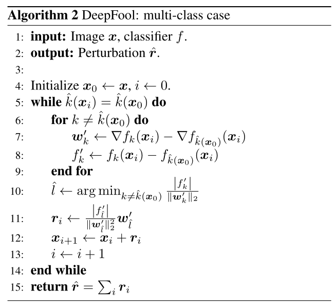 与 DeepFool 攻击二分类器相似,则多分类器的对抗扰动为: