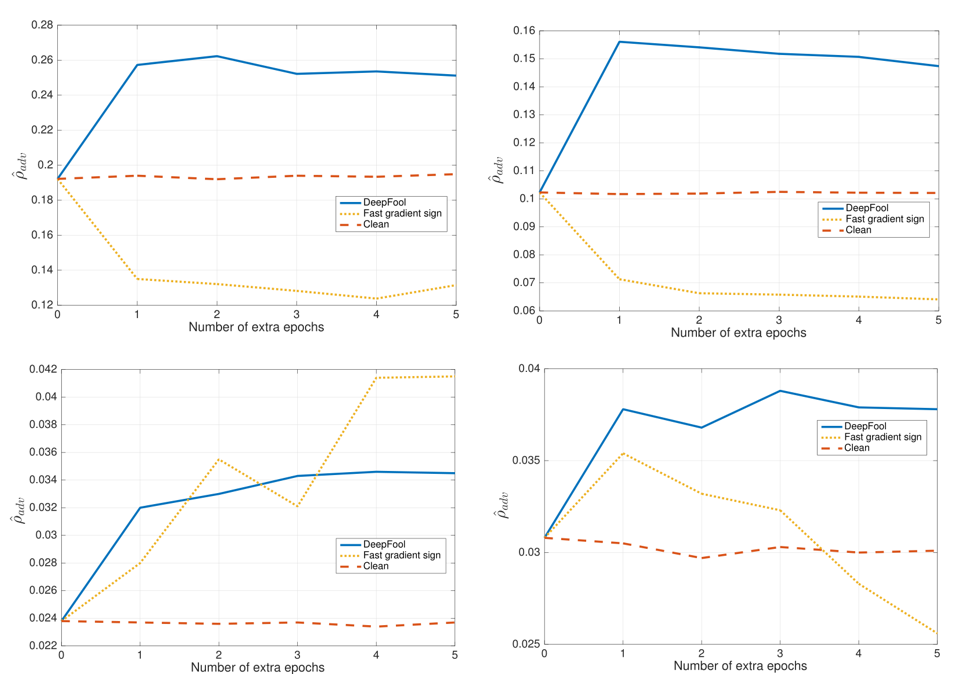 下图表示的是不同微调策略中平均对抗扰动的变化情况,DeepFool 生成的对抗样本的经过微调显著提高了网络模型的鲁棒性,其中 MNIST 网络的鲁棒性提高了 50%,NIN 的鲁棒性提高了约 40%。