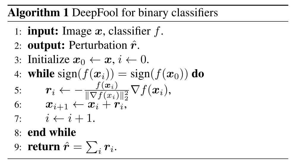 该论文写作方式是由浅入深,先介绍了 DeepFool 攻击二分类器的算法。