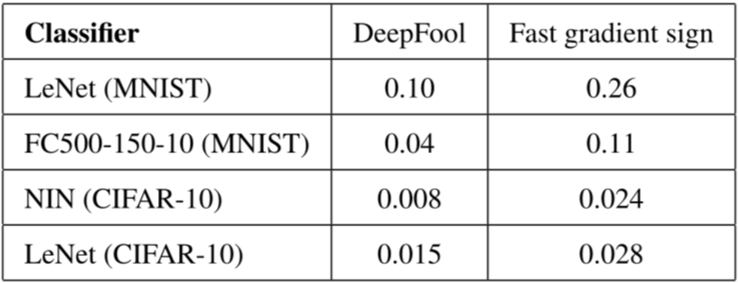 下表给出的是 DeepFool 和 FGSM 攻击的平均扰动情况,会发现 DeepFool 的平均扰动要远小于 FGSM,这就印证了 FGSM 过分的评估了分类器的鲁棒性。