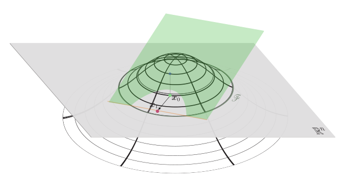 下图示对算法的生动的解释,以 n=2 为例, ,绿色平面是 点处的切平面为 ,则此时会投影出现迭代点 ,然后依次类推,最终将所有的扰动综合起来即为所求的对抗扰动。