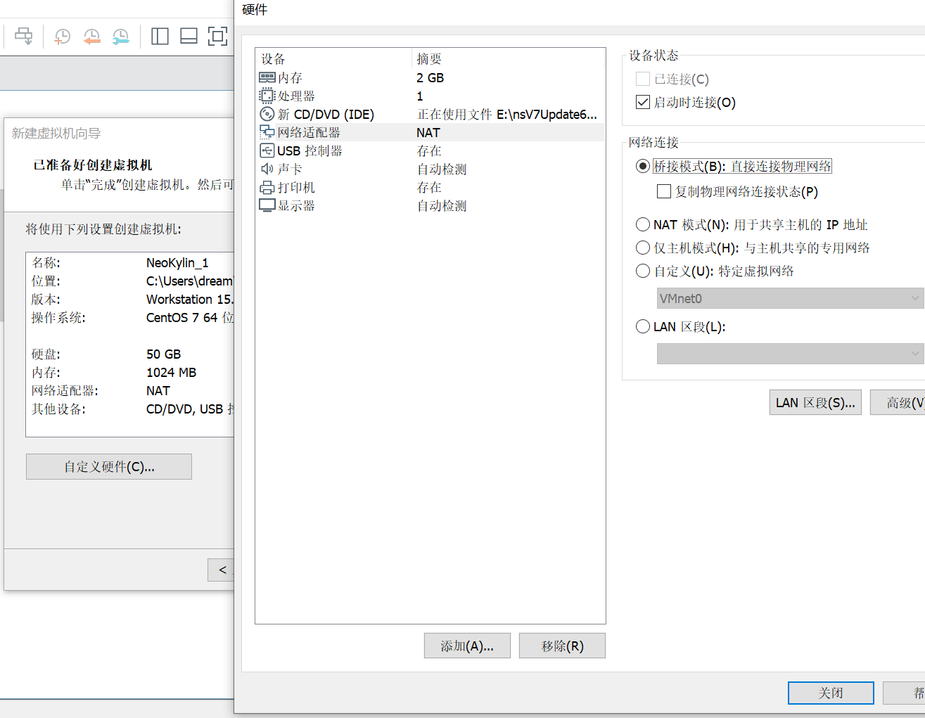 - 再次我将内存修改为了2GB,比较重要的是对网络适配器的修改,为了让物理主机连上虚拟机,作为新手我选择的是桥接,介于打印机并不需要,我们可以对它选中,然后移除