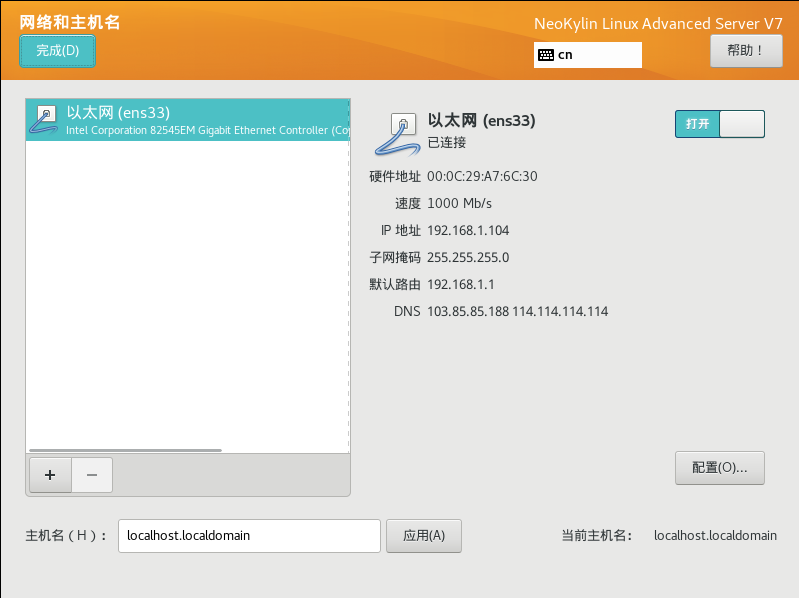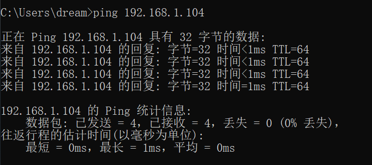 - 在网络和主机名里面,将以太网连接打开,由于是桥接模式,会自动识别主机IP地址。使用cmd,ping虚拟机上的IP地址,发现是可以ping通的。但是这个是动态的IP地址,后面会再讲配置静态IP的方法。