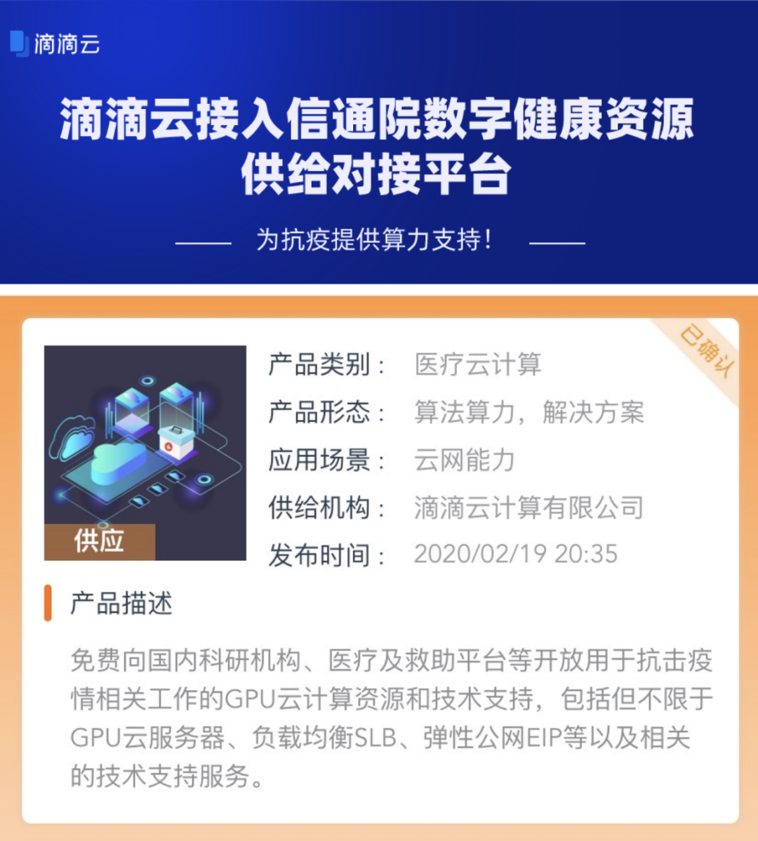 2、参与工信部信通院数字健康资源供给协调平台工作,报名项目为滴滴云免费开放GPU算力,助力抗击疫情专题——已报名并成功收录上线。