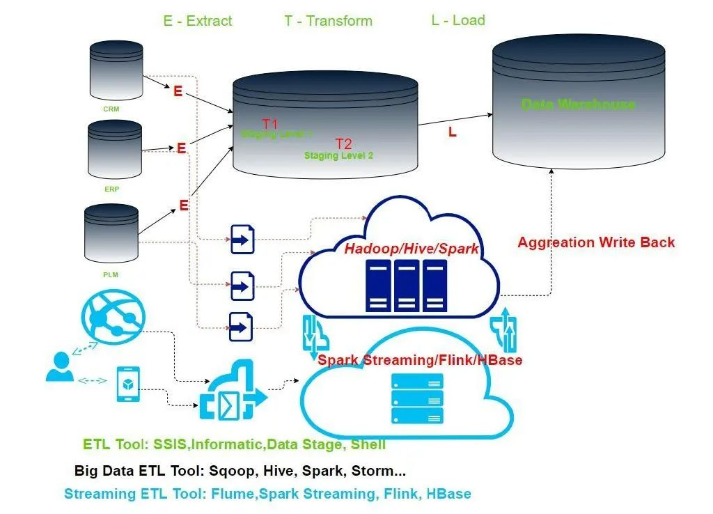 此时的ETL工具,围绕着 MapReduce 做了很多改造,比如 Sqoop, Hive, Spark 等等。借助这些工具,最终完成聚合计算,并同步到数据仓库中。