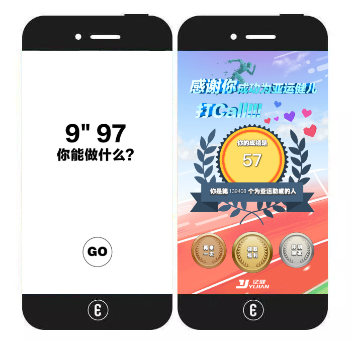 内容特色:该H5主要将七夕与亚运会联系在了一起。用户进入首页后,可通过点击“GO”按钮浏览一段快闪视频。视频主要围绕“9″97你能做什么?”而展开,并引导用户关注亿健品牌盛典。视频结束后,用户可通过一个助威小游戏为亚运健儿加油。游戏玩法很简单,只需在10秒内不断点击屏幕即可,点击次数越多,助威值越高。游戏结束后,用户还可查看自己的助威成绩。