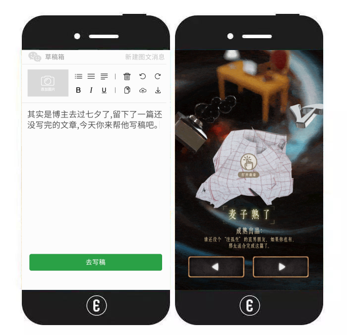 内容特色:该H5先以模拟微信公众号后台的方式,向用户传达“博主去过七夕了,留下了一篇还没写完的文章”这一信息,以引导用户通过“去写稿”按钮浏览一段穿越式的过渡短视频。视频结束后,用户可查看6个不同的草稿箱,并完成任意一个草稿箱中的内容,以生成一篇公众号文章。