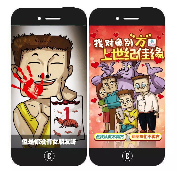 内容特色:该H5主要以动画视频的方式进行品牌推广。视频主要讲述了动画主角为实现脱单而请传家之宝——神灯帮忙找对象的故事,从配音到画面都极尽搞笑之能,可有效吸引用户目光。