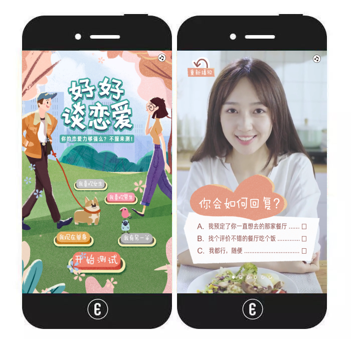 内容特色:该H5共包含4套视频类情景测试题,每套题分别有6道题。用户进入首页后,可先选择性取向(喜欢女生or男生)以及情感状况(单身or有另一半),再进入相应的答题测试环节。视频均使用第一视角拍摄,整体播发流畅,且很有代入感。答题完毕后,用户可输入名字,以获得一份结果海报。海报中包含6个角度的雷达图以及与用户最相似的影视剧人物。