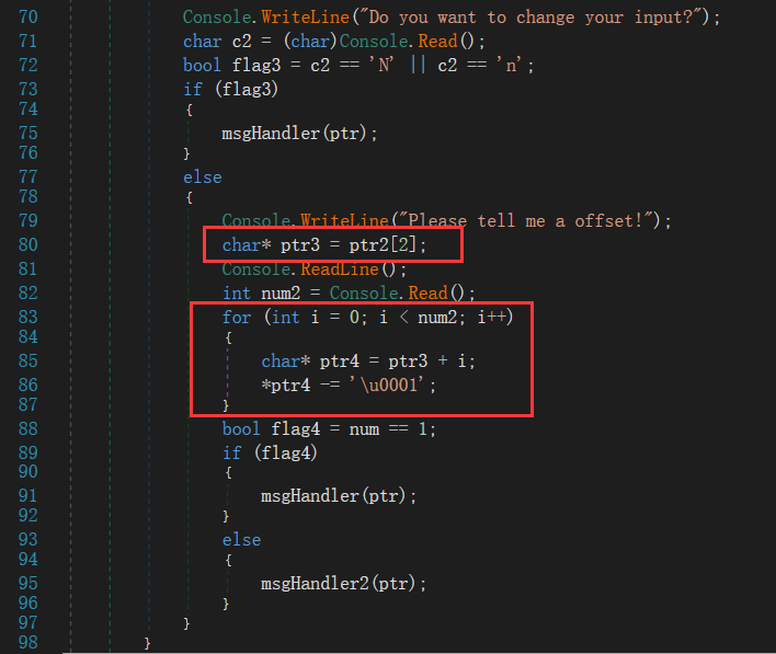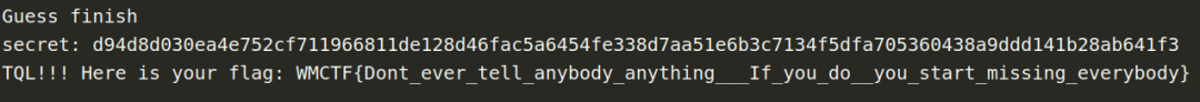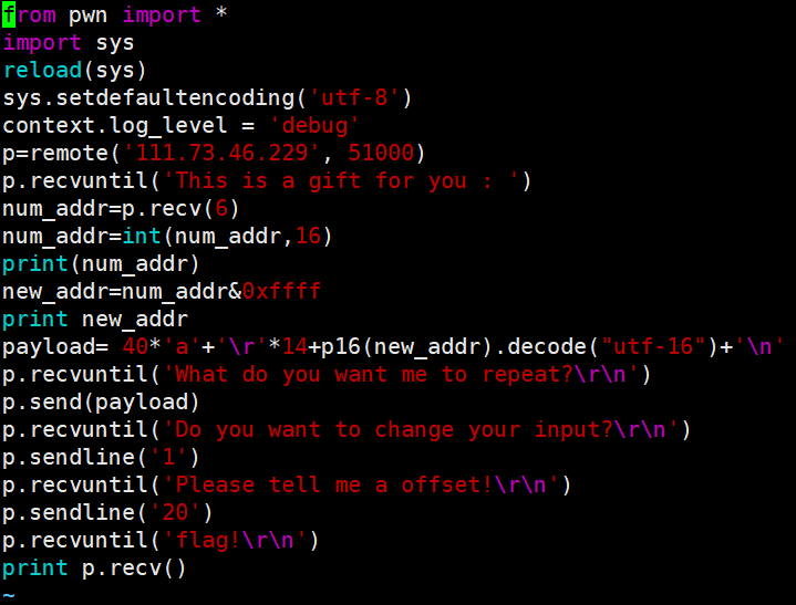 from pwn import *import stringimport itertoolsfrom hashlib import sha256import redef PoW(part, hash_value):for x in itertools.product(string.ascii_letters+string.digits, repeat=4):nonce = ''.join(x)if sha256(nonce+part).hexdigest() == hash_value:return noncedef xor(a, b):assert len(a) == len(b)return ''.join([chr(ord(a[i])^ord(b[i])) for i in range(len(a))])sh = remote('81.68.174.63', 16442)s1 = sh.recvuntil('Give me XXXX:')re_res = re.search(r'sha256\(XXXX\+([0-9a-zA-Z]{16})\) == ([0-9a-z]{64})', s1)part = re_res.group(1)hash_value = re_res.group(2)print 'part:%s hash:%s' % (part, hash_value)nonce = PoW(part, hash_value)print 'Find nonce: %s' % nonceprint 'PoW finish.'sh.sendline(nonce)s2 = sh.recvline().strip()IV = s2[-32:].strip().decode('hex')print 'IV: ', IV.encode('hex')sh.recvline()sh.recvline()sh.recvline()sh.recvline()print 'Start guess secret...'secret = ''now_IV = IVtarget_IV = IVfor padding_len in range(47, -1, -1):sh.sendline('1')sh.recvuntil('Your message (in hex): ')msg = '\x00' * padding_lensh.sendline(msg.encode('hex'))target_cipher = sh.recvline().strip().decode('hex')now_IV = target_cipher[-16:]for i in range(256):send_msg = msg + secret + chr(i)send_msg = xor(xor(send_msg[:16], target_IV), now_IV) + send_msg[16:]sh.sendline('1')sh.recvuntil('Your message (in hex): ')sh.sendline(send_msg.encode('hex'))test_cipher = sh.recvline().strip().decode('hex')now_IV = test_cipher[-16:]if test_cipher[:48] == target_cipher[:48]:secret += chr(i)print '[%d/%d]' % (len(secret.encode('hex')) // 2, 48), secret.encode('hex')target_IV = test_cipher[-16:]breakprint 'Guess finish'print 'secret:', secret.encode('hex')sh.sendline('2')sh.recvuntil('Your guess (in hex): ')sh.sendline(secret.encode('hex'))flag = sh.recvline()print flag