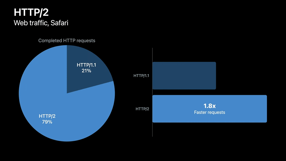 Mehta表示,上个月,Safari加载的所有网页中约有79%是通过HTTP/2连接加载的,一般HTTP/2的加载速度是旧版HTTP/1.1的1.8倍。