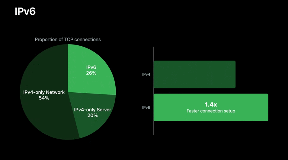 在近期的WWDC 2020会议上的简短技术演讲中,苹果分享了一些内部统计数据,希望以此来说服应用开发人员采用新的Web技术和协议,例如IPV6、HTTP/2、TLS 1.3以及多路TCP等。