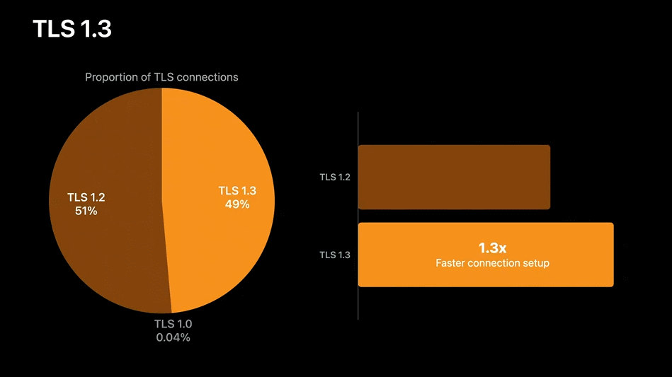 Mehta表示,在过去的一个月中,现代苹果设备上所有HTTPS网络连接中49%都采用了TLS1.3,通过TLS 1.3建立HTTPS连接的速度比旧版TLS 1.2快1.3倍。