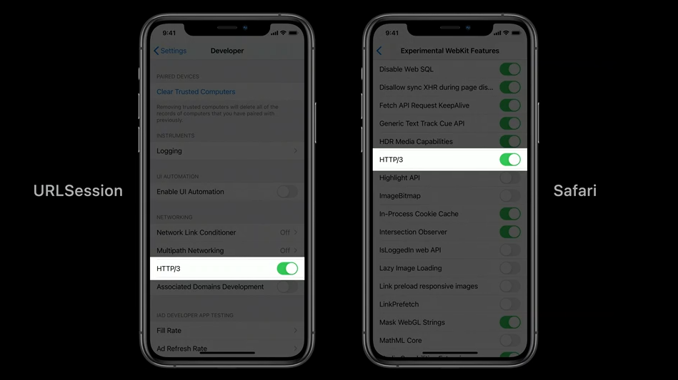 然而,HTTP/3的支持默认被禁用了,并且仅出于实验目的苹果设备才包含了对HTTP/3的支持,用户和应用开发人员必须打开启用HTTP/3的选项。