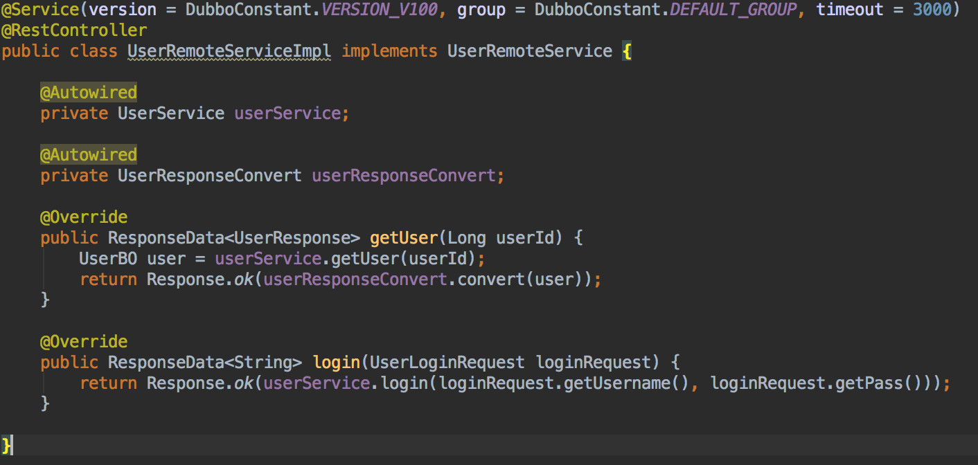 在实现类中同时暴露两种协议,加上 Dubbo 的@Service 和@RestController 注解。