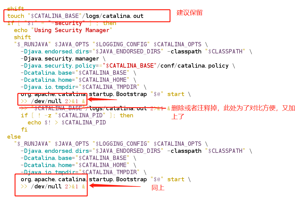 最近遇到系统关系Catalina.out日志文件持续变大的问题,已经影响到了生产环境的使用空间,多次设置 conf/logging.properties 设置参数为off发现并不起作用,对于error级别的仍旧不能过滤。于是参考tomcat的shell脚本,看启动命令行的调用,如下如所示,发现startup脚本调用的是catalina.sh脚本(带箭头部分),由此可以推断出 启动脚本相关参数依据是catalina.sh的相关配置,于是就vim catalina.sh,在这里果然找到 Catalina.out日志 的设置信息,于是对日志部分设置null处理,再次启动,就不会有任何日志产生,具体设置见下图