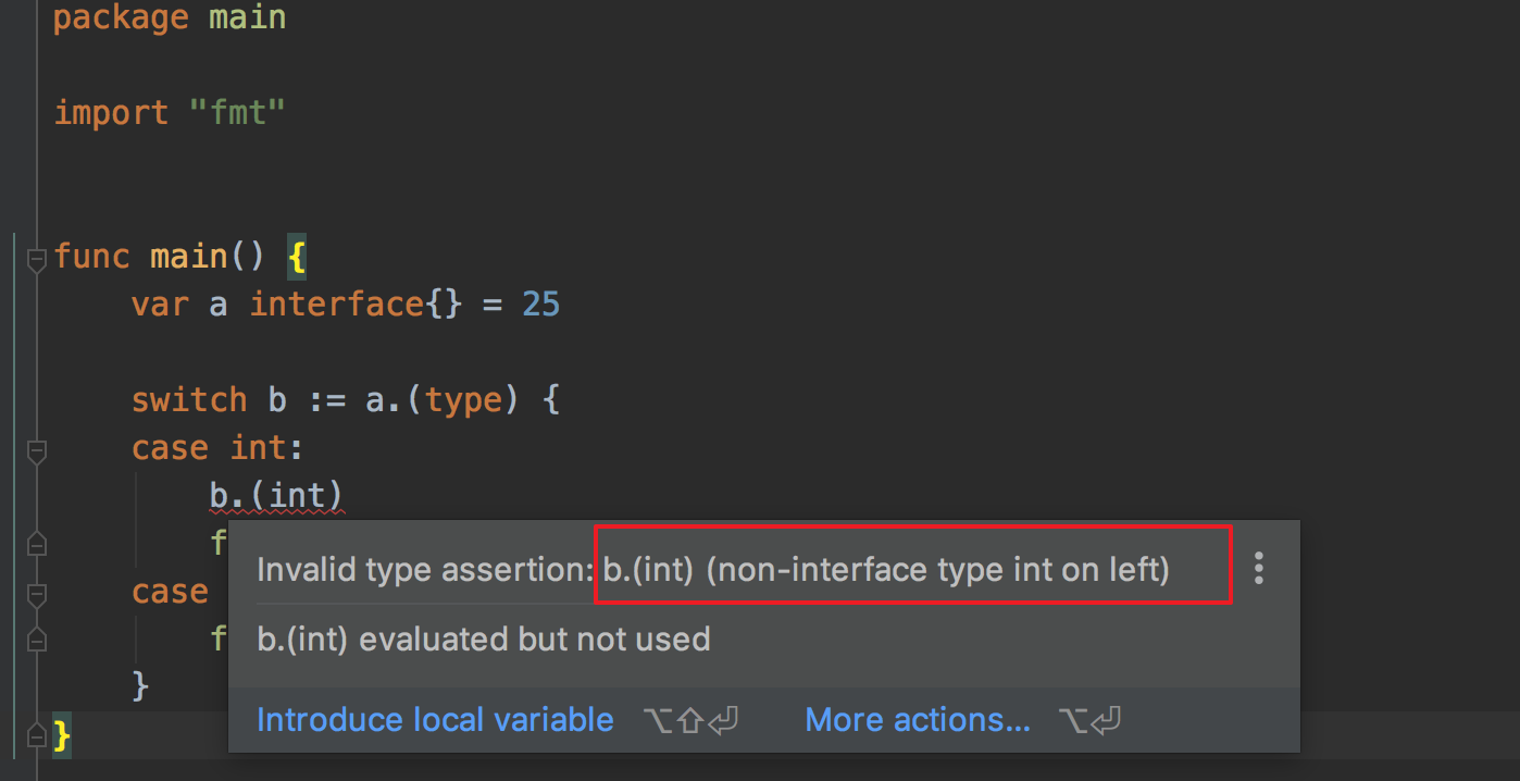 验证方法也很简单,使用完一次类型断言后,对返回的对象再一次使用类型断言,Goland 立马就会提示我们新对象 b 不是一个接口类型的对象,不允许进行类型断言。