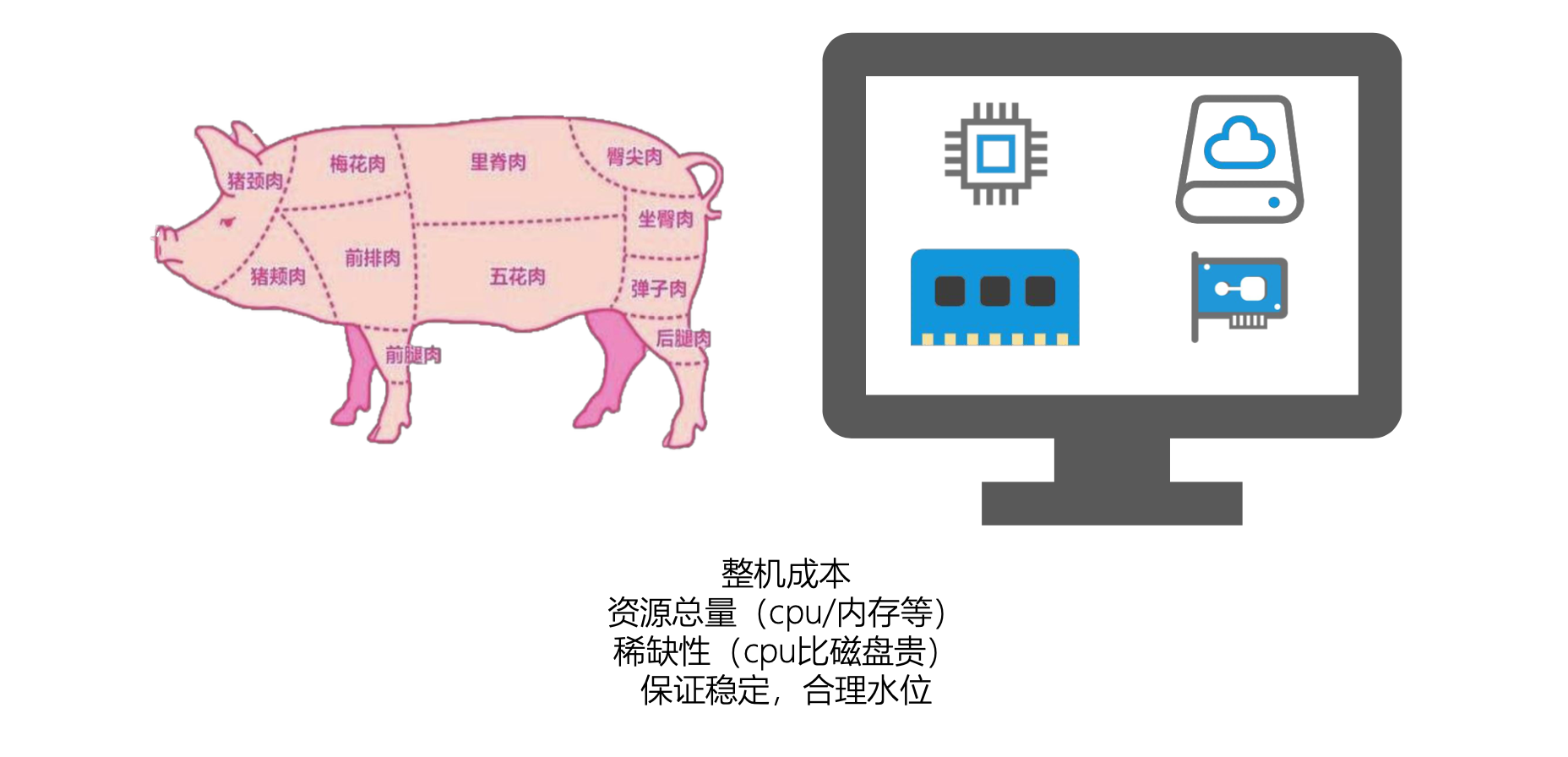 其实就像猪不同部位的价格是不同的,不同的原因是因为资源稀缺性的差别。比如说在离线计算场景中,CPU 就比磁盘要更稀缺,它的定价可能就会更高一点。